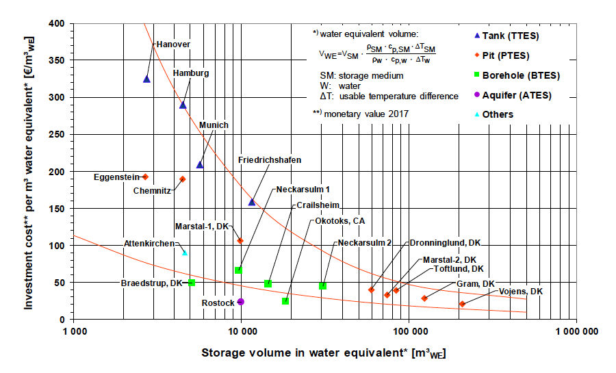 To compare pit and borehole storage, the volume of the latter is converted into water equivalent, as soil cannot take up nearly as much heat. For example, the 63,360 m3 borehole storage system built in Neckarsulm, Germany, holds only 10,000 m3 of water equivalent, according to the Solites chart shown above. But even much smaller borehole storage projects in Germany have already seen their cost drop below 50 EUR/m3, and they could be reduced further by building larger systems.