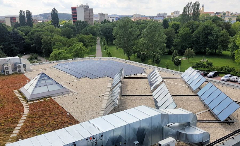 Solar-assisted hot water on the roof of a dormitory building of Slovak University of Agriculture in Nitra, around one hour away from Bratislava. Photo: Solrico