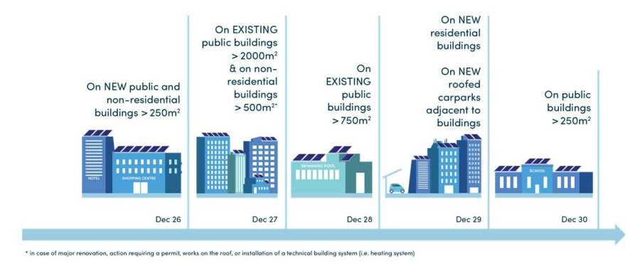 The following infographic outlines the timeline and types of building impacted by the EPBD regulations. Member States are required to ensure that certain new buildings are designed to maximize their solar energy generation potential based on the site’s solar irradiance. This will enable the cost-effective installation of solar technologies in the future.