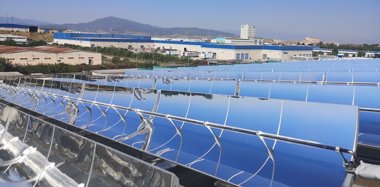 3 MW solar space heating and cooling system with parabolic trough collector field from the German company Soliterm on the roof of the new production hall of MM Graphia in Izmir in operation since 2022.